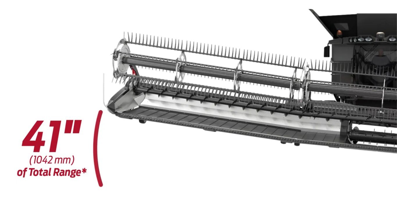 A 50-foot FD2 FlexDraper features 17 inches of wing flex, plus an additional 24 inches of lateral tilt, providing a total flex range of up to 41 inches on either end, independent of the combine. The FD2 PLUS builds on this by adding a full-length flexing cutterbar.