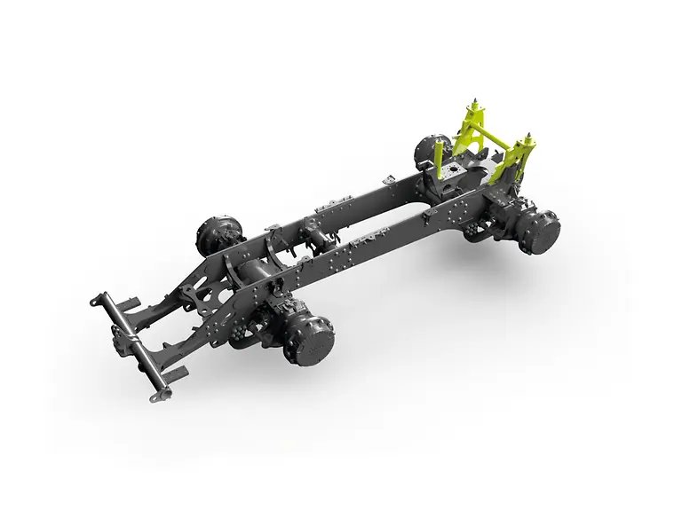 The XERION is ideal for carrying heavy loads, thanks to its unique frame construction. Bolted rather than welded crossbeams in the frame provide greater strength and load-carrying capacity. The heavy-duty axles are designed to carry loads of up to 15 t per axle at speeds of up to 31 mph (50 km/h). Despite its size and weight, with two steered axles, the XERION is remarkably agile and maneuverable.