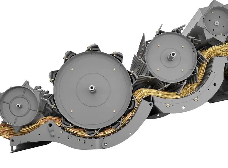 The secondary separation via the straw walkers occurs over a total length of 149 5/8 in (3,800 mm) across four straw walker steps. Even large volumes of straw are transported rapidly and loosely.